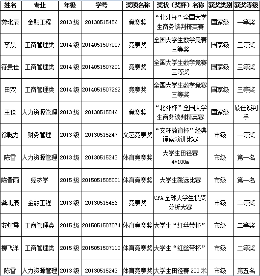 伊莉讨论区 2013级金融工程专业龚北辰、王佳、李晨等同学荣获国家级比赛奖项,2013级财务管理专业徐乾力和人力资源管理专业的陈雷同学等多人荣获市级奖励。