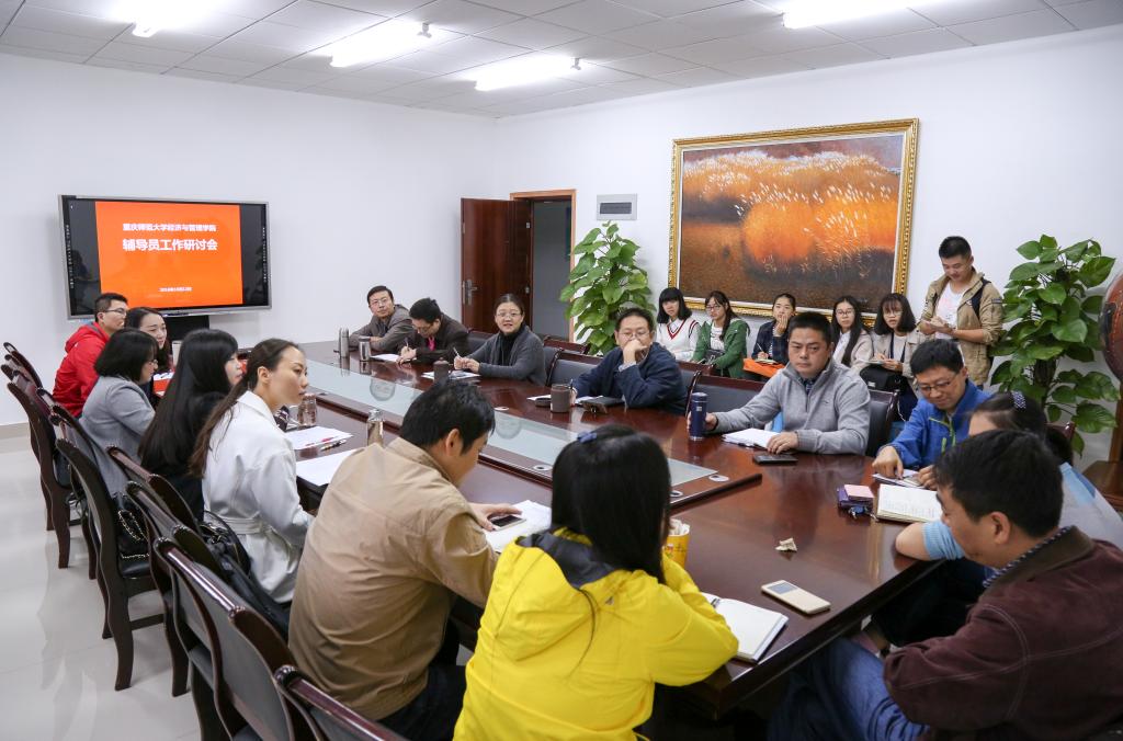 分党委书记税强主持会议。5位辅导员和4位班主任结合年级或班级实际情况,对本年级的工作目标、工作思路、工作经验及特色工作逐一进行了介绍和交流,随后,与会人员就学风建设、制度建设、队伍建设等方面对学生工作的开展进行研讨,为学生工作与教学工作协同发展提出切实可行的建议和意见。2015级辅导员唐爽认为,学生培养是从大一到大四的连续性培养的过程,辅导员要及时针对低年级学生暴露出来的问题进行分析和处理,为后续的学生工作奠定基础。2015、2016级经济学一本班主任冉亚清老师介绍到,学生工作重在抓习惯、抓学习、抓思想,具体来讲就是要加强学生的时间管理能力,引导学生把重心放在学习上,帮助学生建立起在能力、目标、道路上的自信。研究生班主任岳晓峰老师表示,学生工作要“多问”“多念”“多催”,全方位地关心学生。与会人员还针对学生工作当中存在的问题和不足进行了分析和探讨,如就采取何种举措切实加强学风建设、如何培养和管理学生干部队伍、如何把国际班学生在国外学习的正能量传递给国内学生等问题展开了激烈讨论。参会学生代表也结合伊莉讨论区