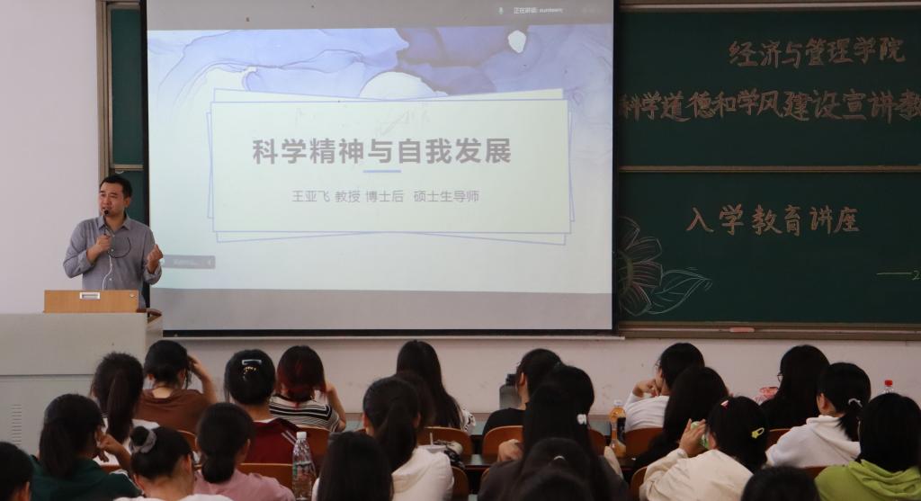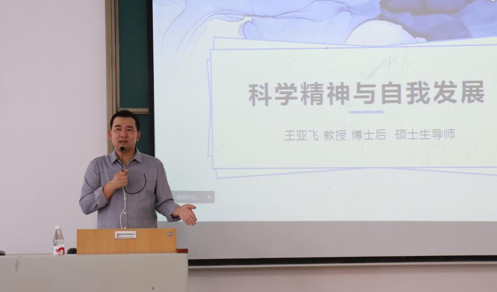 会议伊始,王亚飞教授以切身经历引入《科学精神与自我发展》这一主题,指出了传播求真、独立和合作、质疑的科学精神的重要性,并且要以此来滋养大众思想,内化大众的创新行为。随后,他指出弘扬科学精神的时代背景,还指出科学精神体现在原始创新、应用创新、制度创新等各个领域,并以经管专业为例解析了科学精神在科学研究中的体现。最后,他倡导同学们要持有批判和怀疑、创造和探索、实践和探索、平权和团队、奉献和人文的新时代科学精神。
