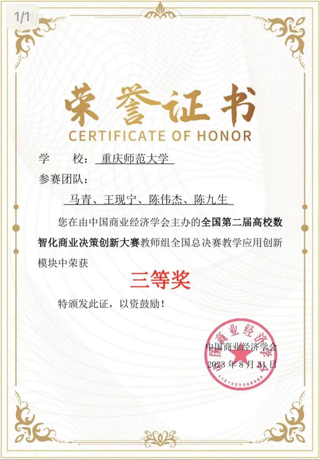 教师马青、王现宁、陈伟杰、陈九生四位博士组团提交作品《数智化视阈下<“移动”市场营销>课程教学改革探索》参加比赛,最终获教师组全国总决赛教学应用创新模块三等奖。作品基于移动端(手机、平板等)与当下最新自媒体平台相结合,围绕数智化技术作为教学工具和手段在教学中的运用创新进行教学设计,充分体现了数智化技术在教学环节和教学改革中的深度融合。