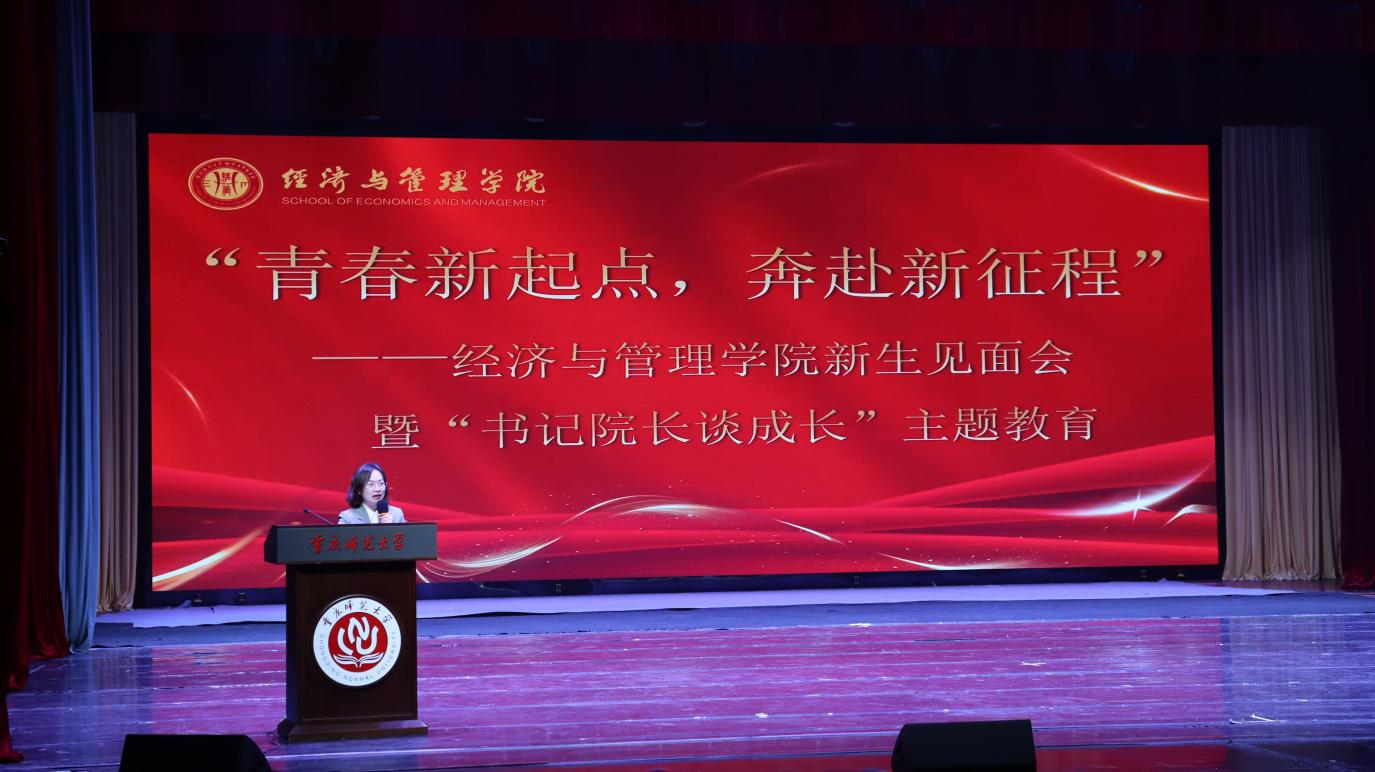 二十年来的发展历程与辉煌成就,强调学院始终坚守“立教无类,以文化人”的办学理念,并认真践行“致知、致用、致远”的校训精神,致力于培育满足党和国家需要的经管优秀人才。她指出新同学的到来为学院注入了新鲜血液,并对他们未来的发展充满了期待。