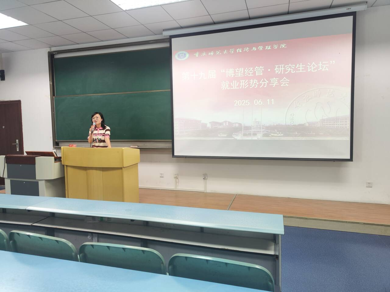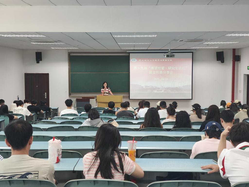 在求是楼321教室成功举办第十九届“博望经管·研究生论坛”。本次论坛聚焦于农业硕士研究生当前就业形势分析与破局策略,辅导员向薪蓉担任主讲,2023级全体农业硕士研究生参加。