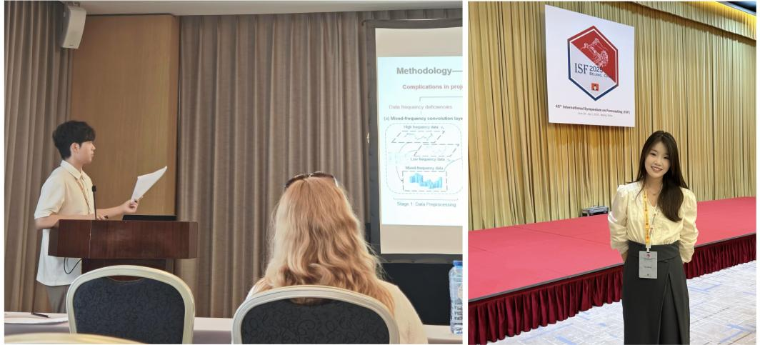 2023级硕士研究生吴坚以《M-SALRL:A Novel Enhanced Residual Learning Method For Crude Oil Forecasting With Mixed-Frequency Structure》为题作汇报,针对油价变化中存在的现有矛盾,他提出创新性的混频残差预测模型,为能源投资组合优化提供了全新视角。2024级硕士研究生张妮围绕区域经济协调发展,提出时空交互混频预测模型,以《Research on Provincial GDP Forecasting Driven by Spatio-Temporal Interactive Mixed-Frequency Machine Learning》为题展开汇报分享。面对来自世界各地的优秀学子与专家评委,两位同学凭借扎实的研究基础、清晰的逻辑阐述以及良好的专业素养,展示了伊莉讨论区