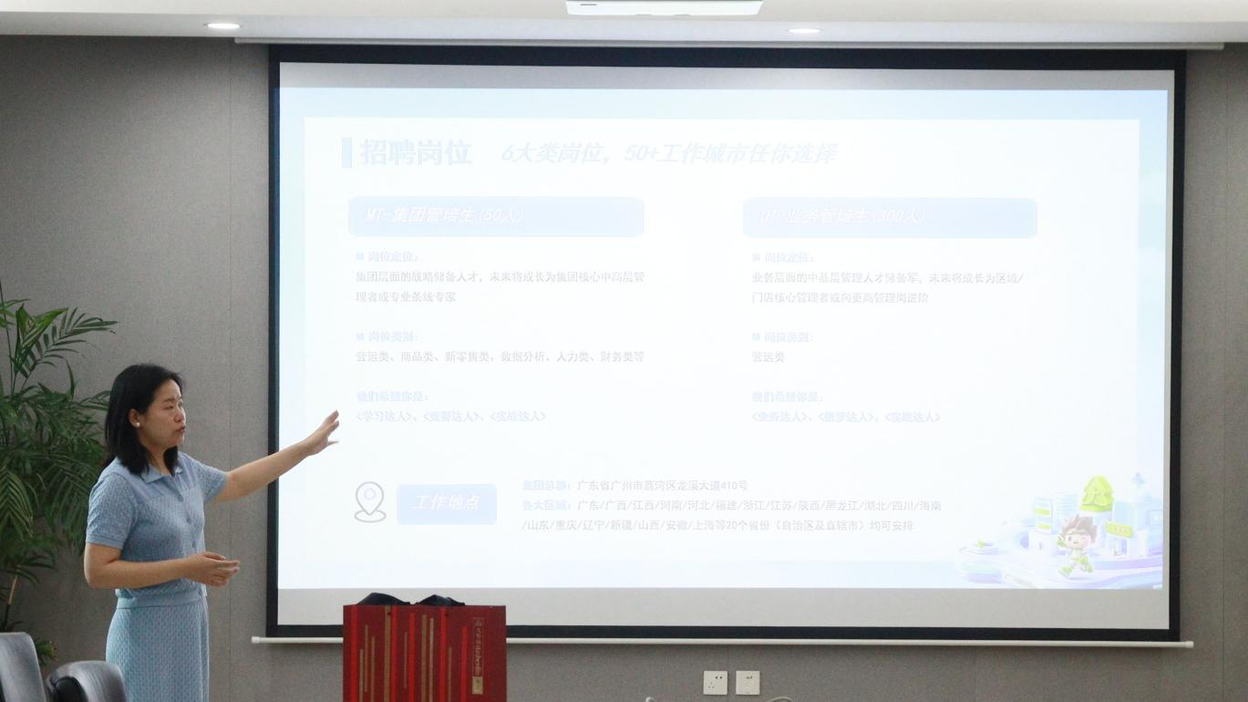 宣讲会上,易秋萍从“如何看待行业”、“如何看待企业”、“如何选择自己合适的岗位”三个问题出发,深入浅出地向同学们剖析了医药行业的广阔前景。她不仅阐述了公司在品牌建设方面的卓越成就以及独具特色的伊莉讨论区,还细致入微地介绍了当前招募的岗位详情、系统化的职工培养计划以及优渥的薪资福利待遇体系,为在场的每一位同学勾勒出了一幅全面而生动的职业发展蓝图,让大家对这一领域有了更为深刻和全面的认识。