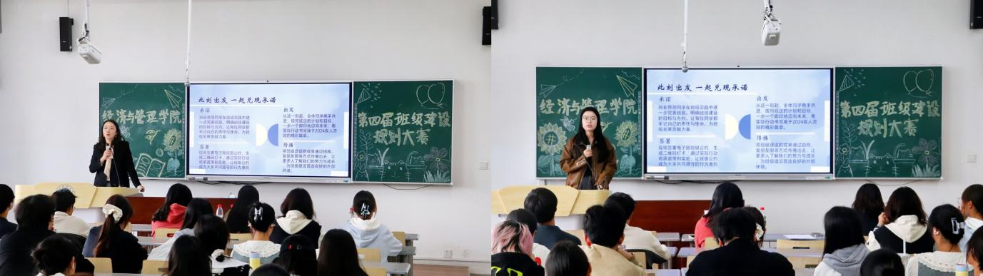 于砺志楼T2301举办第四届班级建设规划大赛决赛。本次活动邀请学院团委书记兼学工办主任张莉、辅导员龚朝珍和尚立担任评委,共有四个班级入围决赛。