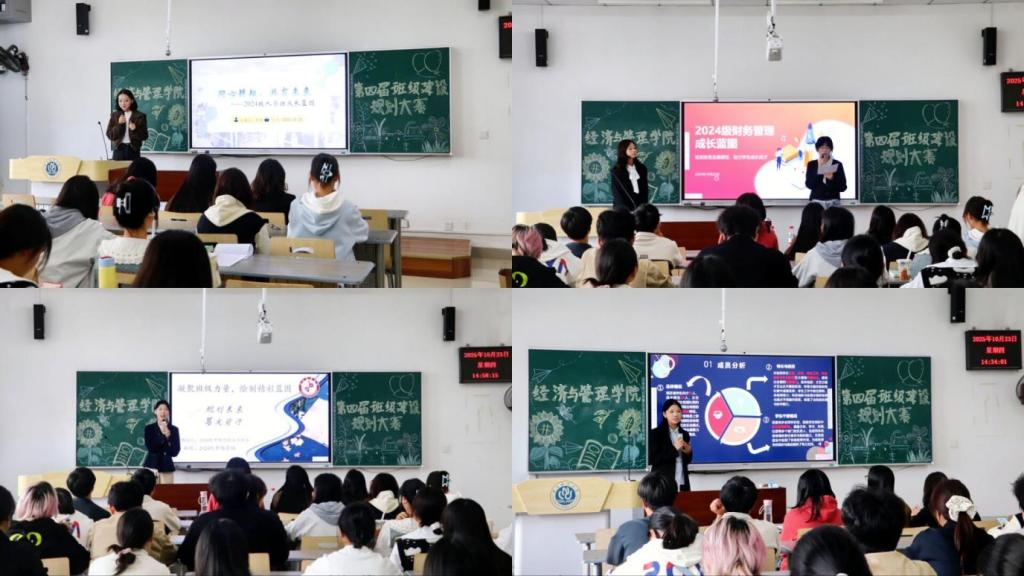 决赛现场,各班参赛队伍依次登台,围绕班级基本情况、建设理念和未来发展目标等板块进行系统阐述,通过精心制作的PPT和精彩演讲,全面展示了班级特色风貌与建设蓝图,彰显了经管学子积极向上的精神面貌。在答辩环节,评委老师就规划内容的可行性、创新性与代表性进行深入提问,并提出建设性意见。