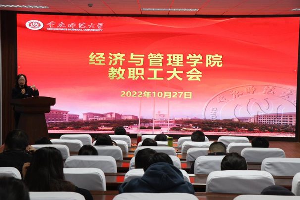 在求是楼517召开教职工大会。会议有两项议程,一是党委书记钟敏做“解读党的二十大报告 再看大学生就业”专题导学报告,二是学院领导总结布置近期工作。全体教职工参会。