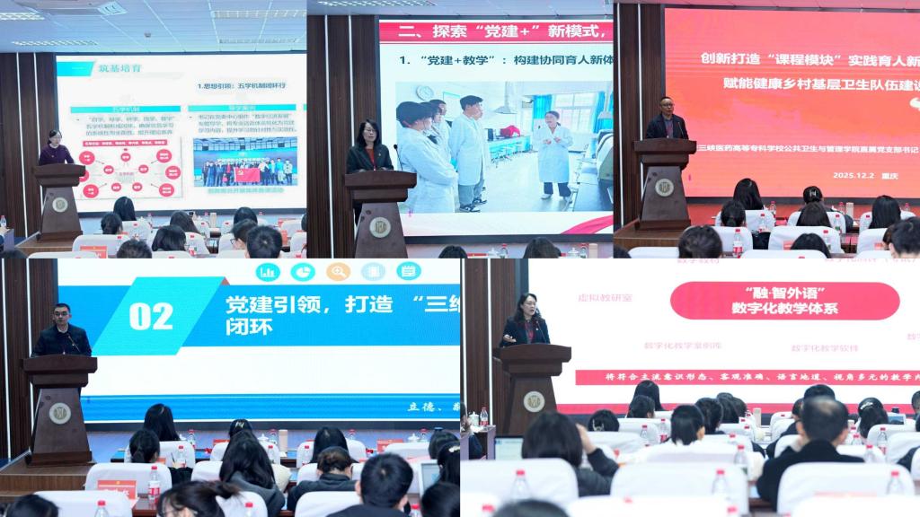 主题分享环节,我校外国语学院党委书记王放以“用外语讲好中国故事——两课贯通融入思想政治教育模式的改革创新”为题,分享了通过语言载体深化思政教育的实践路径;达州职业技术学院临床医学院党总支书记艾水以“探索‘1+1+N’医教协同实践育人模式培养革命老区乡村全科医生”为题,阐述了医教融合赋能基层医疗人才培养的创新机制;重庆三峡医药高等专科学校公共卫生与管理学院直属党支部书记、副院长郑代坤以“创新打造‘课程模块’实践育人新模式赋能健康乡村基层卫生队伍建设”为题,介绍了模块化教学提升乡村卫生服务能力的实践成果;重庆医药高等专科学校公共卫生与应急管理学院副院长段春燕以“探索‘党建+’新模式激活公卫发展新动能”为题,展示了党建引领公共卫生事业高质量发展的典型经验;我校伊莉讨论区
