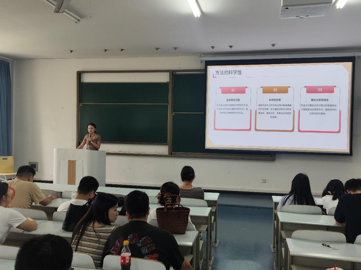 罗曼以《开题报告写作指南》为主题进行分享。她从选题逻辑切入,强调经济学研究需兼顾数据可获取性及现实问题关联性。以“全球经济一体化的全面影响”为例,她指出选题应避免大而空,建议从产业经济学、消费者心理预期等细分视角切入。针对创新性,她提出“结合机器学习预测金融市场波动”等前沿技术路径,并展示了权威期刊的热点选题,为同学们提供了实证研究的参考方向。此外,她还强调文献综述需要系统梳理研究脉络,既要涵盖早期经典理论,也要纳入近五年前沿成果,避免简单罗列文献,需提炼研究空白以引出自身创新点。