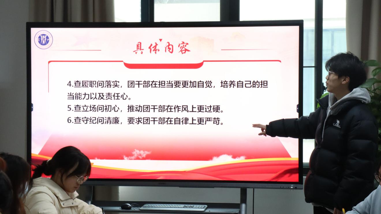 研讨过程中,杨淋从指导思想、工作目标、具体内容、工作要求四方面展开讨论。具体阐释了团委干部成员应以习近平新时代中国特色社会主义思想为指导,深入学习贯彻党的二十大精神等思想并提出两大工作目标,及时总结工作任务、工作经验,善于自我反省,努力提升自身在思想、政治、能力、担当、作风和自律上的素养;同时希望团干部们要在学中投身实践,深学细悟力行,全身心投入团学工作中。最后,杨淋同学提到,各团干部们应明确自身“加强组织领导、注重统筹结合、强化工作督导、营造浓厚氛围”四大工作要求,在推动教育活动有力开展的同时将教育活动与各单位重点工作有机结合,做到边查边改,着力提升工作实效,达到宣传改进青年工作作风,将教育活动引入人心的效果。
