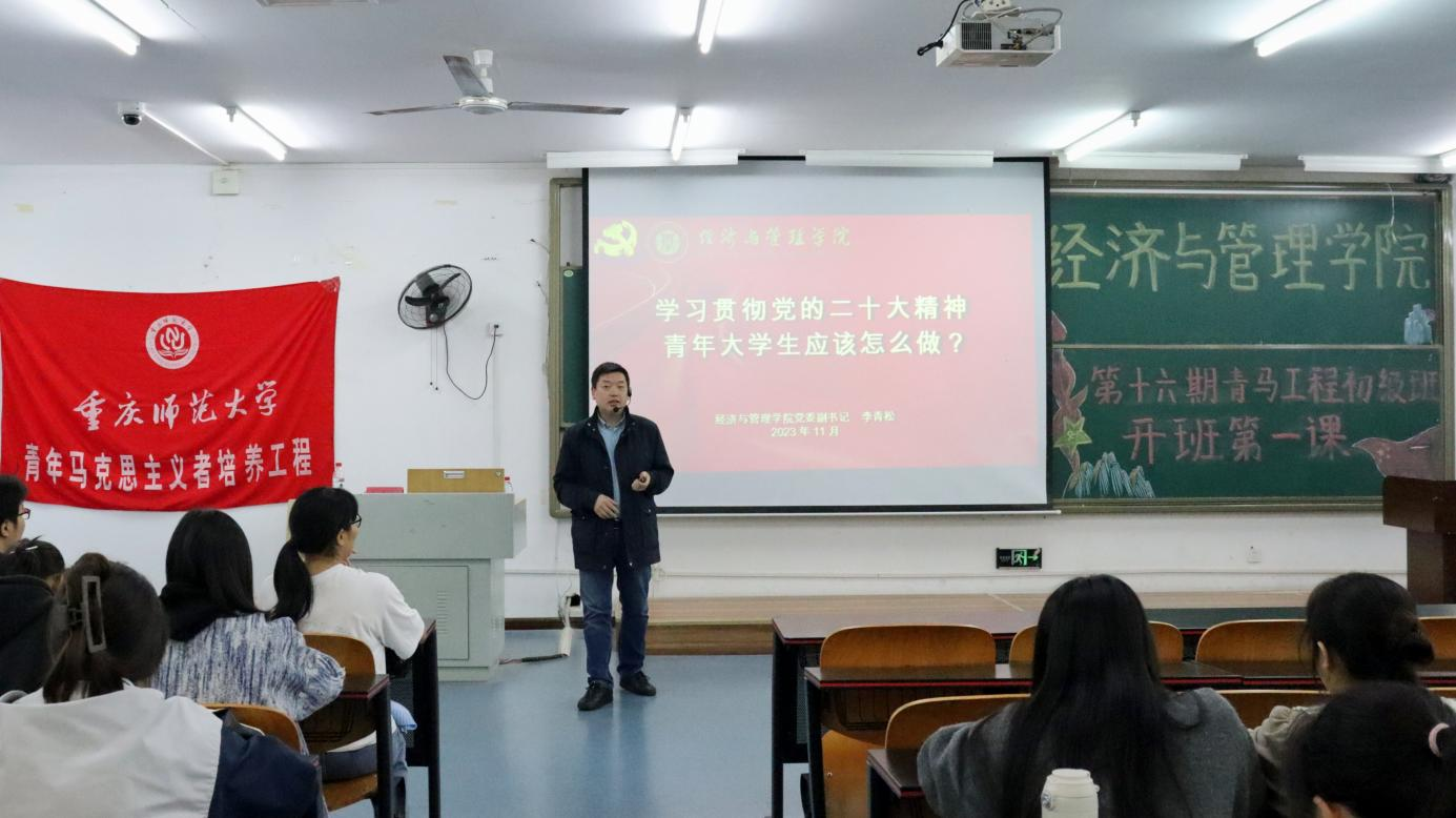 开班仪式结束后,李青松副书记以“学习贯彻党的二十大精神,青年大学生应该怎么做”为主题,开启了第一期“青马工程”培训班理论培训第一讲。他围绕党的二十大主题及成果、马克思主义的中国化和时代化、中国式现代化等七大板块展开讲述,详细介绍了中国共产党的革命历程、建设成果、马克思主义中国化等相关要点,并带领同学们系统学习了“六个坚持”、伟大建党精神、坚持马克思主义的“两个结合”、坚持党的全面领导和全面从严治党相关理论知识,引导广大青年学子自觉学习了解马克思主义,树立坚定的马克思主义信仰。