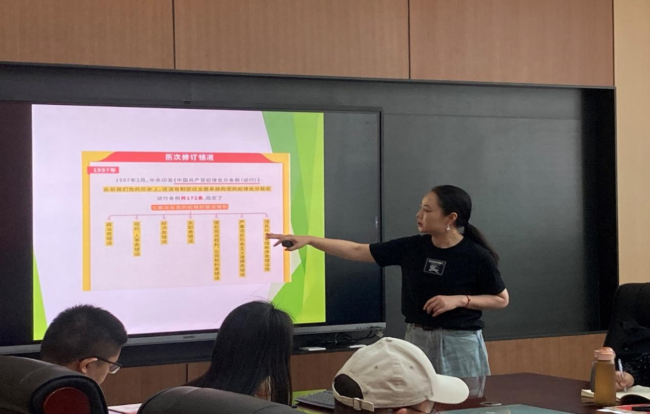 党委书记钟敏以党纪教育为主题给中心组上党课。她介绍了《中国共产党纪律处分条例》多次修订的情况,全面阐释新修订的《条例》的结构和内容,并强调《条例》体现出的从严治党的基调。