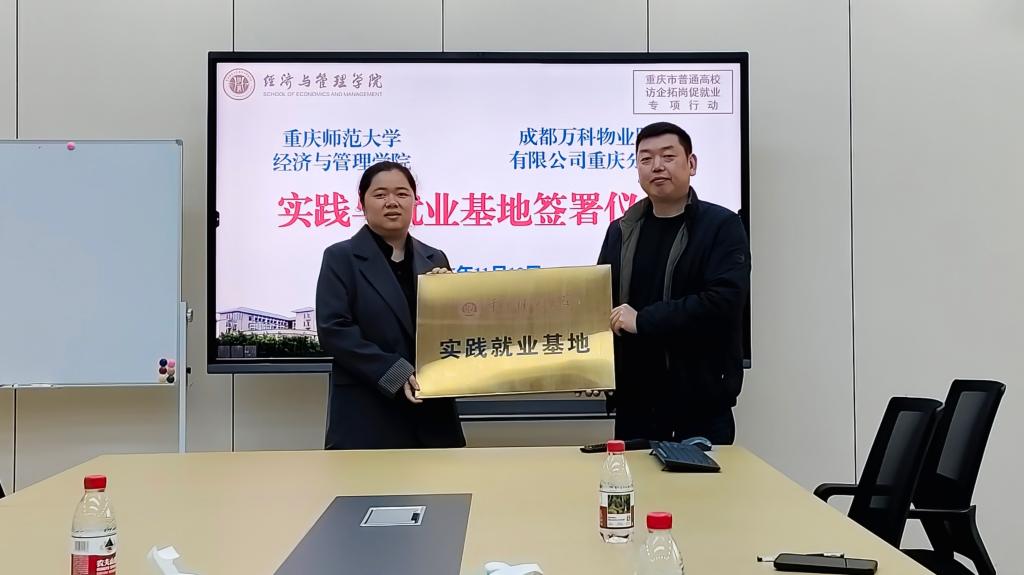 与成都万科物业服务有限公司重庆分公司举行了实践与就业基地签约仪式。学院党委副书记李青松、成都万科物业服务有限公司重庆分公司人事代表王佳佳、辅导员张源出席签署仪式。