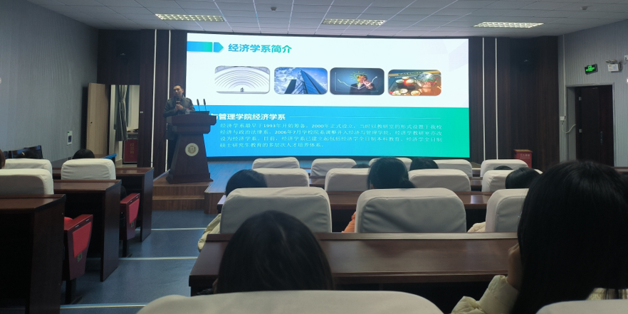 经济系主任杜家廷教授幽默诙谐的向同学们介绍了经济学专业建设成效,就业和升造前景,详细解读人才培养方案,并以亲身经历为例指导同学们做好学业和职业规划,鼓励同学们努力拼搏,成为优秀人才。
