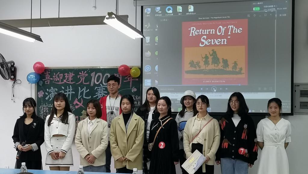 于弘德楼14304教室成功举办“喜迎建党一百周年”演讲比赛。演讲与口才专业兴趣小组组长、2018级工商管理1班江清清,2018级人力资源管理谢辉饶、郑佛雨担任此次比赛评委。