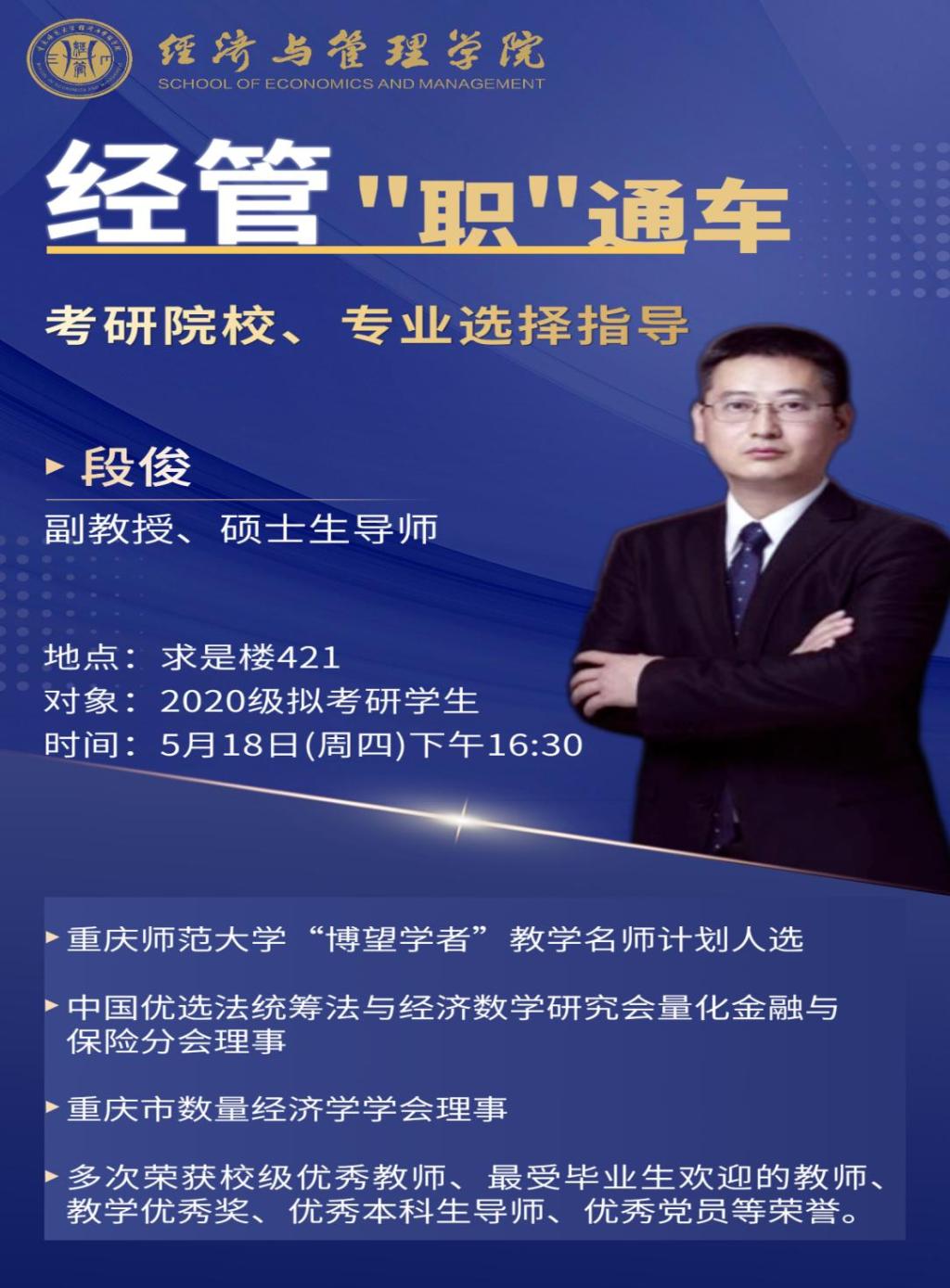 在求是楼421举办考研形势分析和院校、专业选择培训会,硕士生导师段俊以及学工办主任张莉出席本次培训会主讲人,2020级全体拟考研同学积极参与。