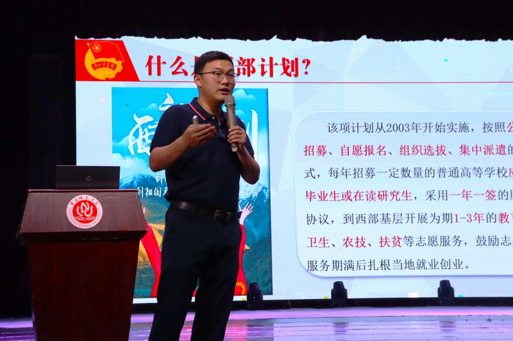 于校友会堂举办西部计划政策解读会,由校团委综合科科长孙玖江主讲,100余名经管学子参与其中。本次讲座采取线上线下相结合的形式,现场进行直播,旨让更多同学了解到西部计划。
