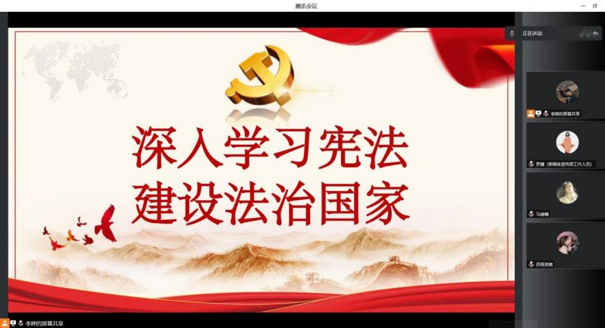 李婷同学通过讲述我国宪法艰难曲折的发展史,说明宪法与国家前途、人民命运息息相关,引导大家自觉地恪守宪法原则、弘扬宪法精神、履行宪法使命。紧接着,她又从“宪法的基本内容”、“公民的基本权利和义务”两方面,介绍了宪法的基本知识,再从“党的领导原则”等六项原则对宪法的基本原则进行阐述。最后,她引出宪法的基本精神和内涵,号召大家作为未来法治中国的桥梁,要厚青年之修养、畅青年之精神、壮青年之意志,从我做起、从现在做起,自觉学习宪法,树立宪法权威、弘扬宪法精神,以推进依法治国。同学们就此展开讨论,并提出自己的法制理念。