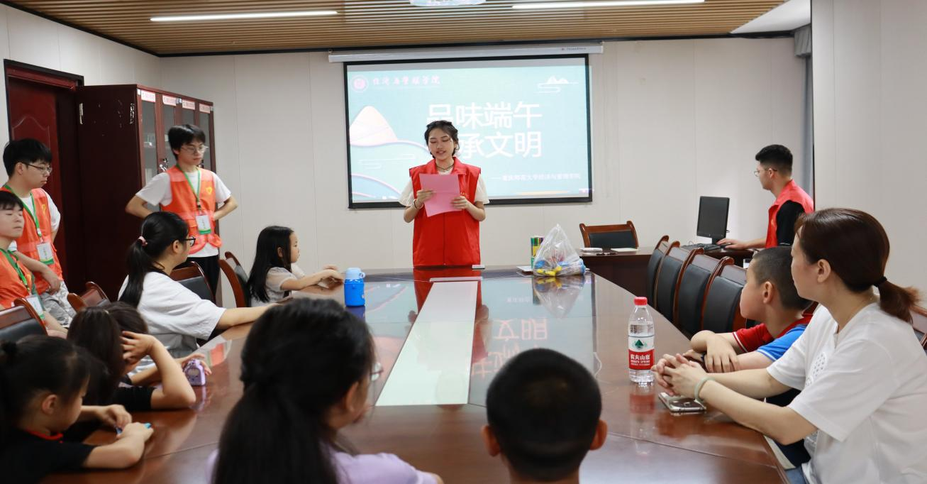 在大成湖社区溪畔互助家工作站举行“品味端午,传承文明”社区志愿者活动,本次活动由刘佩灵同学担任主持人,实践部组织共14名志愿者,给大成湖社区的小朋友们带来了一节特别的文化学习课。