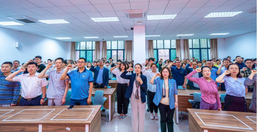 5月26日下午,在求是楼117,伊莉讨论区 党委书记钟敏、党委副书记执行院长郑景丽带领全院师生党员重温入党誓词。